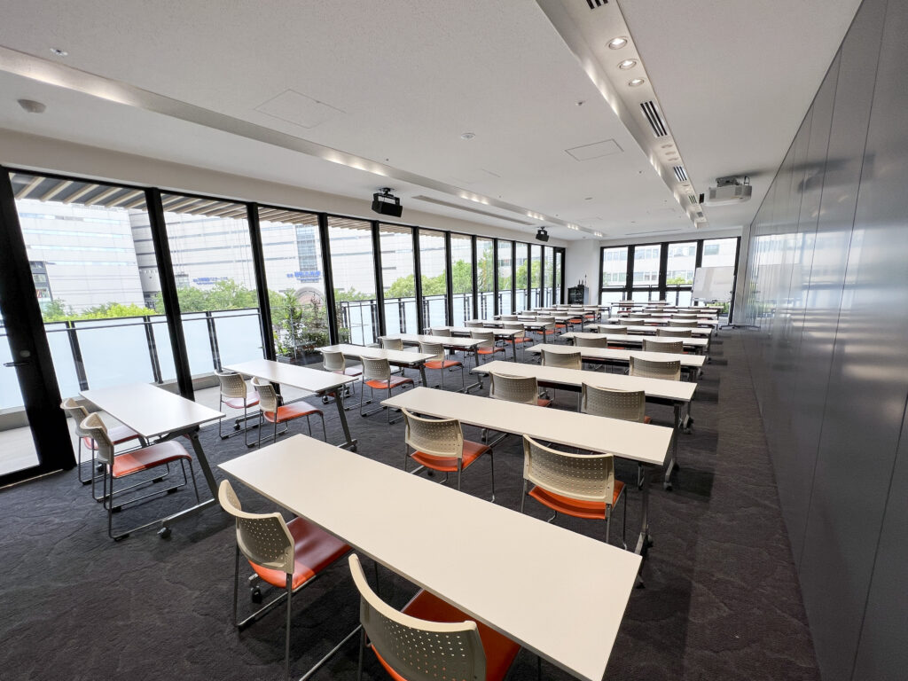 プランには、会場使用料・Wi-Fi・会議机・椅子・ミネラルウォーターと、会議やセミナーの実施に必要不可欠な設備・備品が含まれています。