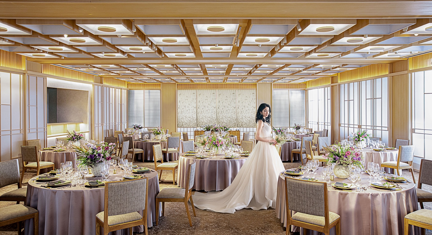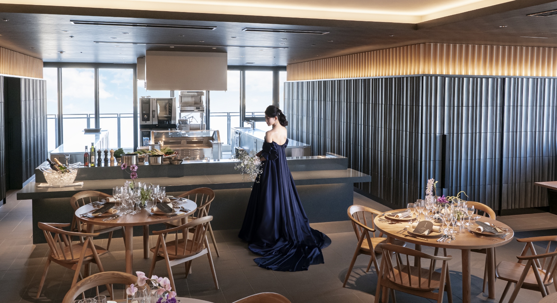 日本の伝統建築美と木のあたたかみを感じるモダンな空間の大人数収容のMEGUMI。瓦素材を大胆に取り入れ、洋装・和装共にあう中小人数向けの和モダン空間のMINORI。シェフが目の前で仕上げるカウンターキッチンスタイルで大切なゲストに安心のおもてなしをお届けします。